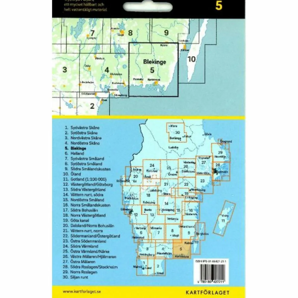 Kartorna är tryckta på Polyart som är helt vattentåligt och rivstarkt, vilket gör dem lämpliga att ta med på turen. Teckenförklaring på svenska, engelsk och tyska.