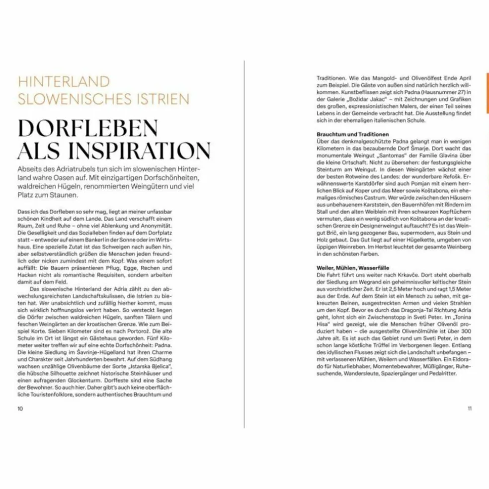 Tiefes Blau, dunkles Rot und sattes Grün. Künstlerstädte, versteckte Buchten und fantastischer Wein. Trubel am Meer, Ruhe im Hinterland und immer eine Meeresbrise im Gesicht. Das – und noch viel, viel mehr – ist Istrien. Silvia Trippolt-Maderbacher, Styria-Bestseller-Autorin und bekennender Istrien-Fan, hat es sich zur Aufgabe gemacht, ‚ihr‘ Istrien für uns in ein Buch zu packen: als fröhliche Einstimmung auf den Urlaub, als Lesevergnügen für Strand und Hotelzimmer, als Sehnsuchtsbuch für zuhause. Mit dabei sind die besten Adressen der Gastronomin und Kulinarik-Expertin, Tipps für Kultur- und Einkaufserlebnisse, persönliche Begegnungen mit den Menschen der Region – und jene versteckten Lieblingsorte, die unsere Reiselust neu entfachen.