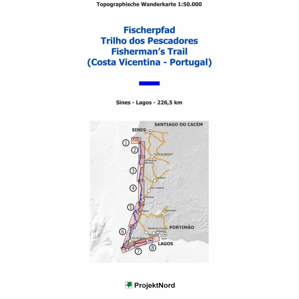 Fischerpfad – Trilho dos Pescadores – Fisherman’s Trail (Costa Vicentina – Portugal). Topographische Wanderkarte Portugal. Wanderleporello 1:50.000. Aus 8 Kartenausschnitten zusammengesetzte Wanderkarte des Fischerpfades (Fischerweg / Rota Vicentina) an der portugiesischen Atlantikküste (Costa Vicentina).