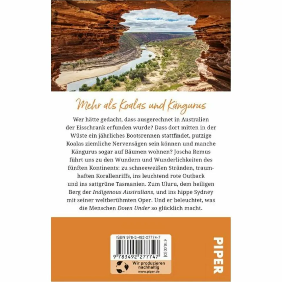 Wer hätte gedacht, dass ausgerechnet in Australien der Eisschrank erfunden wurde? Dass dort mitten in der Wüste ein jährliches Bootsrennen stattfindet, putzige Koalas ziemliche Nervensägen sein können und manche Kängurus sogar auf Bäumen wohnen? Joscha Remus führt uns zu den Wundern und Wunderlichkeiten des fünften Kontinents: zu schneeweißen Stränden, traumhaften Korallenriffs, ins leuchtend rote Outback und ins sattgrüne Tasmanien. Zum Uluru, dem heiligen Berg der Indigenous Australians, und ins hippe Sydney mit seiner weltberühmten Oper. Und er beleuchtet, was die Menschen Down Under so glücklich macht.
