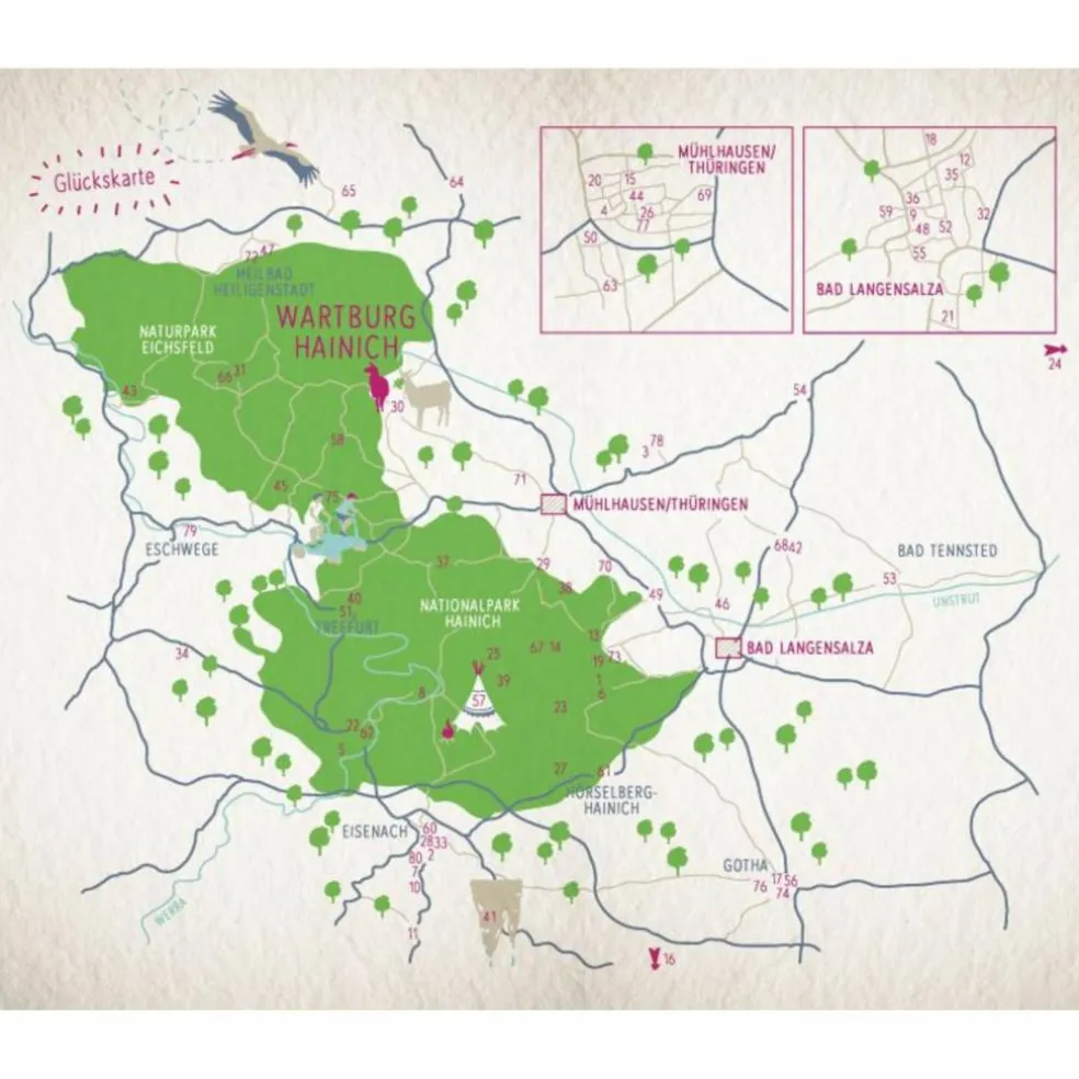 Weltberühmtheiten und versteckte Geheimnisse, wilde Natur und faszinierende Hochkultur – die Welterberegion Wartburg Hainich garantiert Abwechslung pur! Zwischen Werra und Unstrut, Nationalpark und Wartburg präsentiert sich eine facettenreiche Landschaft voller Überraschungen. Märchenhafte Schlösser, alte Ritterburgen, eine Drachenschlucht und echter Urwald machen Ausflüge in Deutschlands grüner Mitte zu unvergesslich schönen Abenteuern. Hier ist das Glück zu Hause!