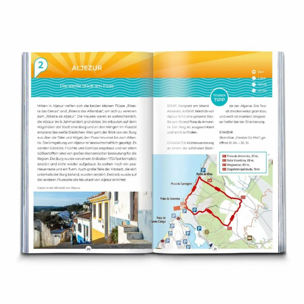 Besser vorher schon wissen, was es zu sehen gibt: Alle 35 Natur- und Wanderhighlights findest du im kompakten Reiseführer Inspiration Algarve. Wasserfälle, einsame Buchten, atemberaubende Aussichten oder einmalige Bergdörfer. Wer will solche Geheim-Tipps nicht schon vor der Reise erfahren? Perfekt für die Urlaubsplanung. So bekommt man schnell einen Überblick, wie man das Beste aus dem Urlaub oder Kurzurlaub macht. Dabei liegt der Fokus voll auf der Natur und einem Aktiv-Urlaub. Vorgestellt werden alle Ziele mit der dazu passenden Wandertour. Eingezeichnet in einer Karte, kompakt beschrieben und mit einem Foto ausgestattet bekommst du schnell einen schönen Eindruck was dich erwartet.