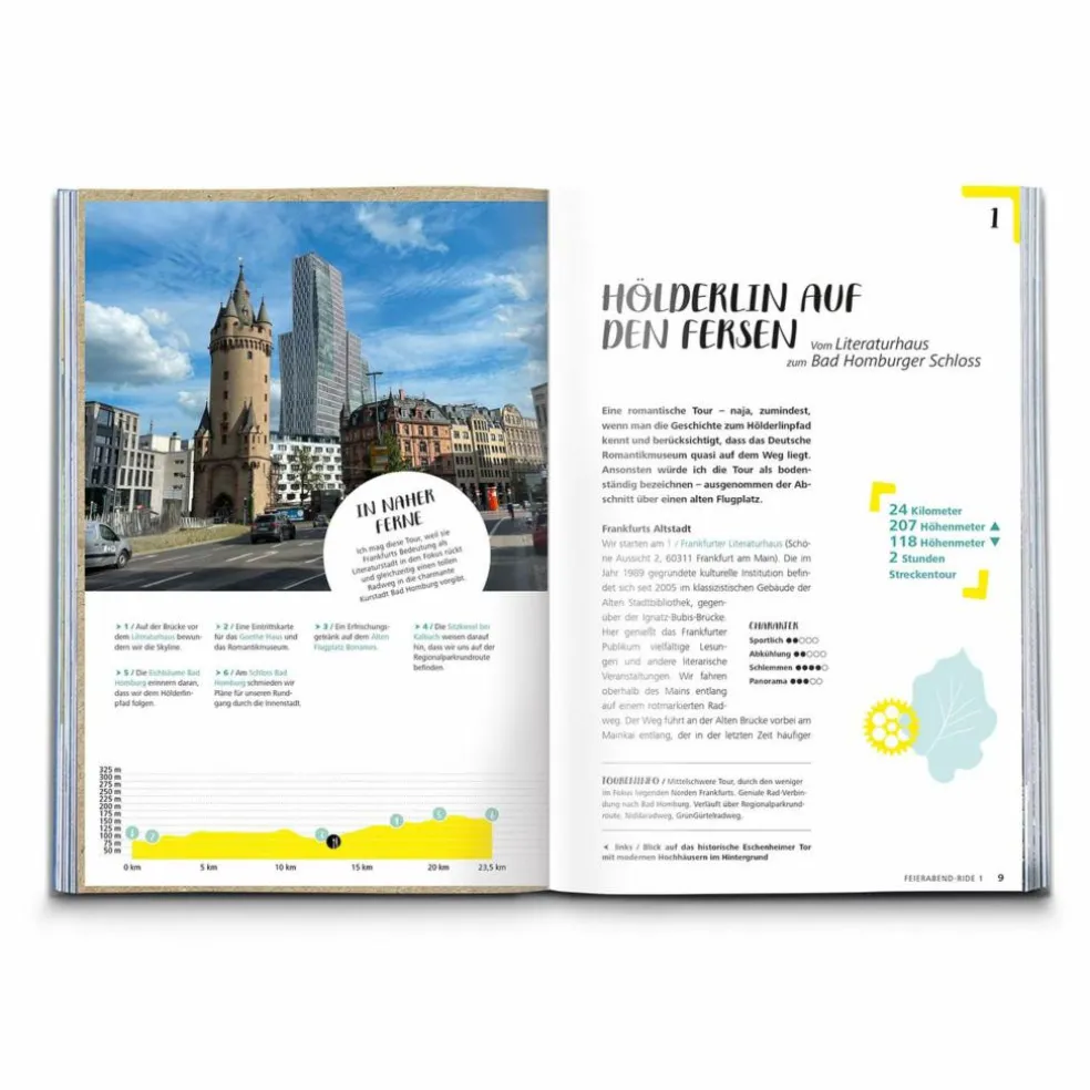 Jede Tour wird ergänzt um Einkehrtipps, Anreiseinfos, Höhenprofil und Tourenkarte. Der Radtourenguide mit Extra-Tourenkarte, App und GPX-Download verbindet Inspiration auf dem Sofa mit einfacher Navigation vor Ort. Ob E-Bike-Einsteiger oder passionierter Pedalritter: Mit unserem Radtourenführer entdeckst du Frankfurt und seine Umgebung neu. Da bleibt nur eines: aufsatteln und losradeln!