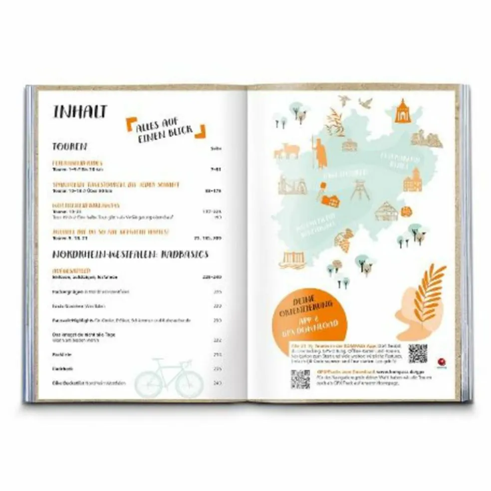 21 1/2 Tagestouren, Feierabend-Rides und Wochenend-Bikeaways führen authentisch und unkonventionell durch Nordrhein-Westfalen. Du radelst zum vielleicht schönsten Schloss in Nordrhein-Westfalen, erlebst die Magie der Externsteine im Teutoburger Wald und machst einen Abstecher in die Niederlande. Kohlehalden im Aachener Revier, Duisburgs Norden mit seinem Malocher-Charme und die Ruhrquelle im Sauerland sind nur ein paar der abwechslungsreichen Ziele, die dich erwarten. Und immer wieder bieten nicht nur Weser, Ruhr und Ems malerische Auenlandschaften und fantastische Deichblicke. Buch, herausnehmbare Karte und App oder GPX-Download verbinden Inspiration auf dem Sofa mit einfacher Navigation vor Ort.