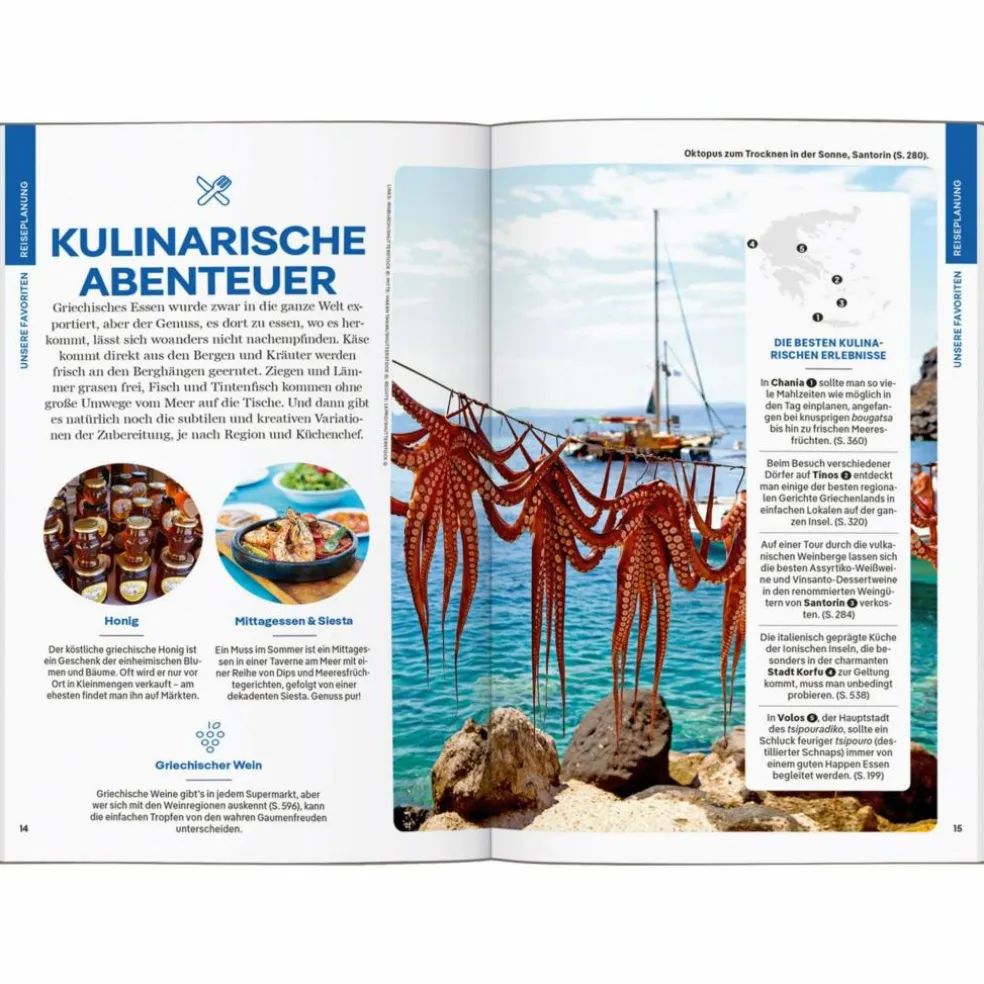 Küchen in Hafennähe angeln sich alles von Makrele über Sepia bis zu Kalmaren. Lecker gegrillt, gebraten, gebacken oder gefüllt mit Käse und frischen Kräutern. Und wo unterwegs aktiv werden und essen? Für jeden größeren Ort gibt es eine Auswahl an Unterkünften und Restaurants für jeden Geschmack und Geldbeutel.
