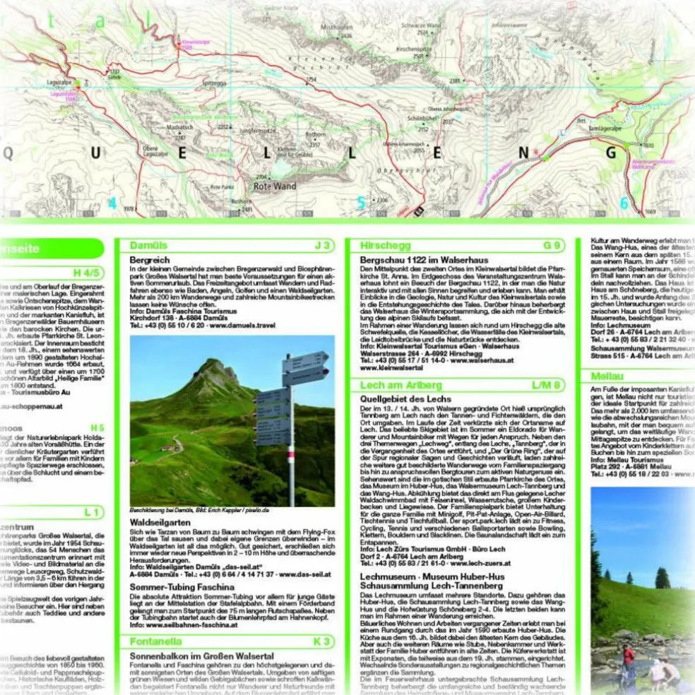Der Bregenzerwald, die größte Region des Bundeslandes Vorarlberg, erstreckt sich, durchzogen von der Ache, beinahe vom Bodensee bis an die Grenze zu Tirol. Er begeistert Wanderer und Mountainbike gleichermaßen mit einer faszinierenden, landschaftlichen Vielfalt: Talengen und flache Senken wechseln sich ab mit den Hügeln des Voralpenlandes und hochalpinen Gipfeln wie Kanisfluh, Diedamskopf oder Widderstein. Wildromantisch, geprägt von steilen, grünen Hängen, an denen Braunvieh grast, Berggipfeln, steilen Schluchten, tosenden Bächen, Wasserfällen und dem klaren Seewaldsee zeigt sich das Große Walsertal. Neben der einmaligen Landschaft warten zahlreiche Museen, die ihre Besucher in die Vergangenheit entführen.