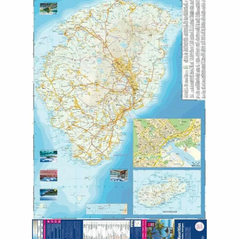 Ausstattung: – Höhenlinien mit Höhenangaben; – Farbige Höhenschichten; – Klassifiziertes Straßennetz mit Entfernungsangaben; – Sehenswürdigkeiten; – Ausführlicher Ortsindex; – GPS-genau; – Längen- und Breitengrade; – UTM-Gitter; – Fünfsprachige Legende (deutsch, englisch, französisch, spanisch, russisch); – Einklinker Rodrigues, kleine Übersichtskarte zur Lage der Maskarenen im Verhältnis zur afrikanischen Ostküste. Handliches Format: 70×100 cm, 2-seitig bedruckt.
