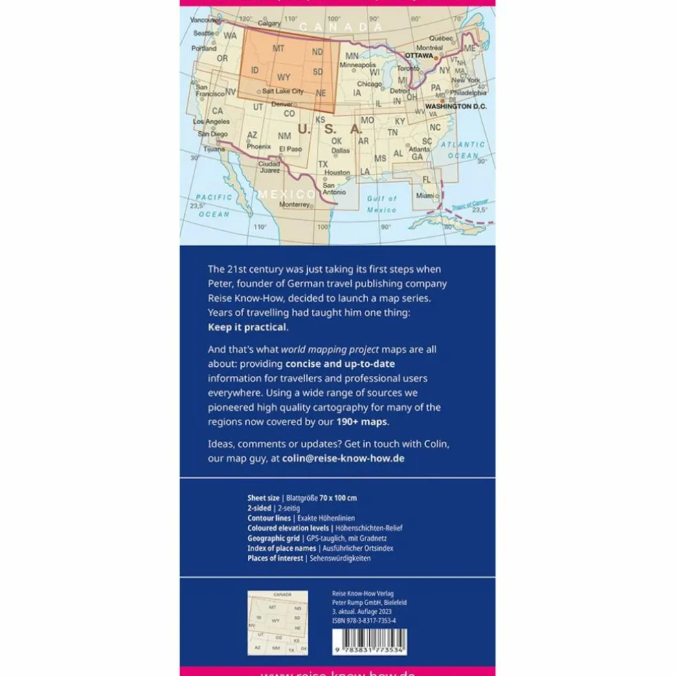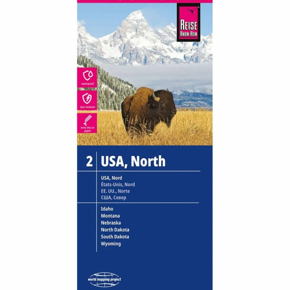 Hochreißfeste und 100% wasserfeste Landkarte „USA, Nord“ aus der Serie world mapping project, erschienen im Reise Know-How Verlag.Diese Karte umfasst die US-Bundesstaaten Idaho, Montana, Nebraska, North Dakota, South Dakota und Wyoming.Reise Know-How Landkarten zeichnen sich durch besonders stabiles Kunststoffpapier aus, das beschreibbar ist wie Papier, sogar mit Bleistift. Der Pappumschlag ist abnehmbar, so dass sich die Karte bequem in jede Tasche stecken lässt. Eine Schutzhülle ist nicht erforderlich. Die kartografische Darstellung konzentriert sich auf die wichtigsten Informationen für Reisende und ist besonders gut lesbar. Statt einer Schummerung werden farbige Höhenschichten verwendet.Ausstattung: – Höhenlinien mit Höhenangaben; – Farbige Höhenschichten; – Klassifiziertes Straßennetz mit Entfernungsangaben; – Sehenswürdigkeiten; – Ausführlicher Ortsindex; – GPS-genau; – Längen- und Breitengrade; – Fünfsprachige Legende (deutsch, englisch, französisch, spanisch, russisch). Handliches Format: 70×100 cm, 2-seitig bedruckt.