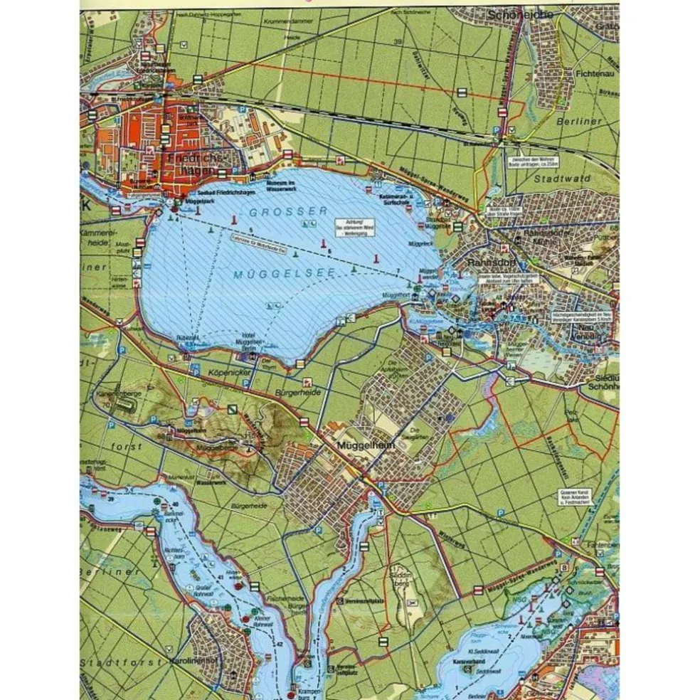 Zugehörige Markierungszeichen finden sich ebenso in der Karte wieder. Die Oberflächen der Radstrecken sind in drei unterschiedlichen Qualitätsstufen dargestellt. Eine wichtige Information für die Wasserwanderer sind die dargestellten Tiefenlinien der Gewässer sowie die Kennzeichnung von gesperrten und befahrbaren Gewässern.