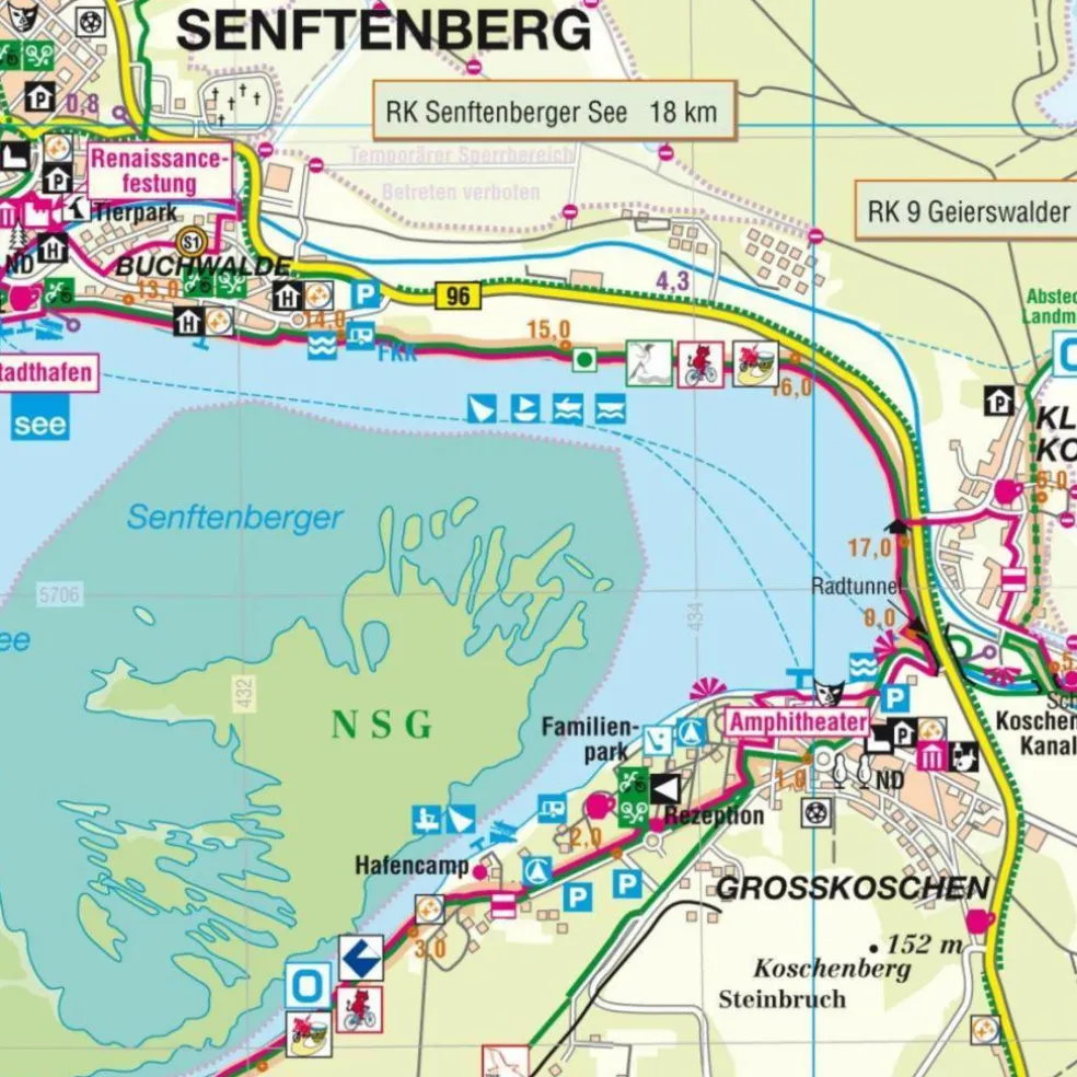 Umfasst das Gebiet Senftenberger See, Großräschener See, Sedlitzer See, Geierswalder See, Partwitzer See, Altdöberner See, Gräbendorfer See sowie den Grünewalder Lauch.Beinhaltet alle markierten Wanderwege als auch Radwege mit deren Kennzeichnung.Durch die Darstellung der naturkundlichen, geologischen und historischen Informationen wird der Kartennutzer auf die großen und kleinen Sehenswürdigkeiten rechts und links des Weges aufmerksam gemacht.Auf der Kartenrückseite findet der Kartennutzer touristische Informationen zu den einzelnen Seen und deren Sehenswürdigkeiten sowie eine Beschreibung zu Ausflugszielen.