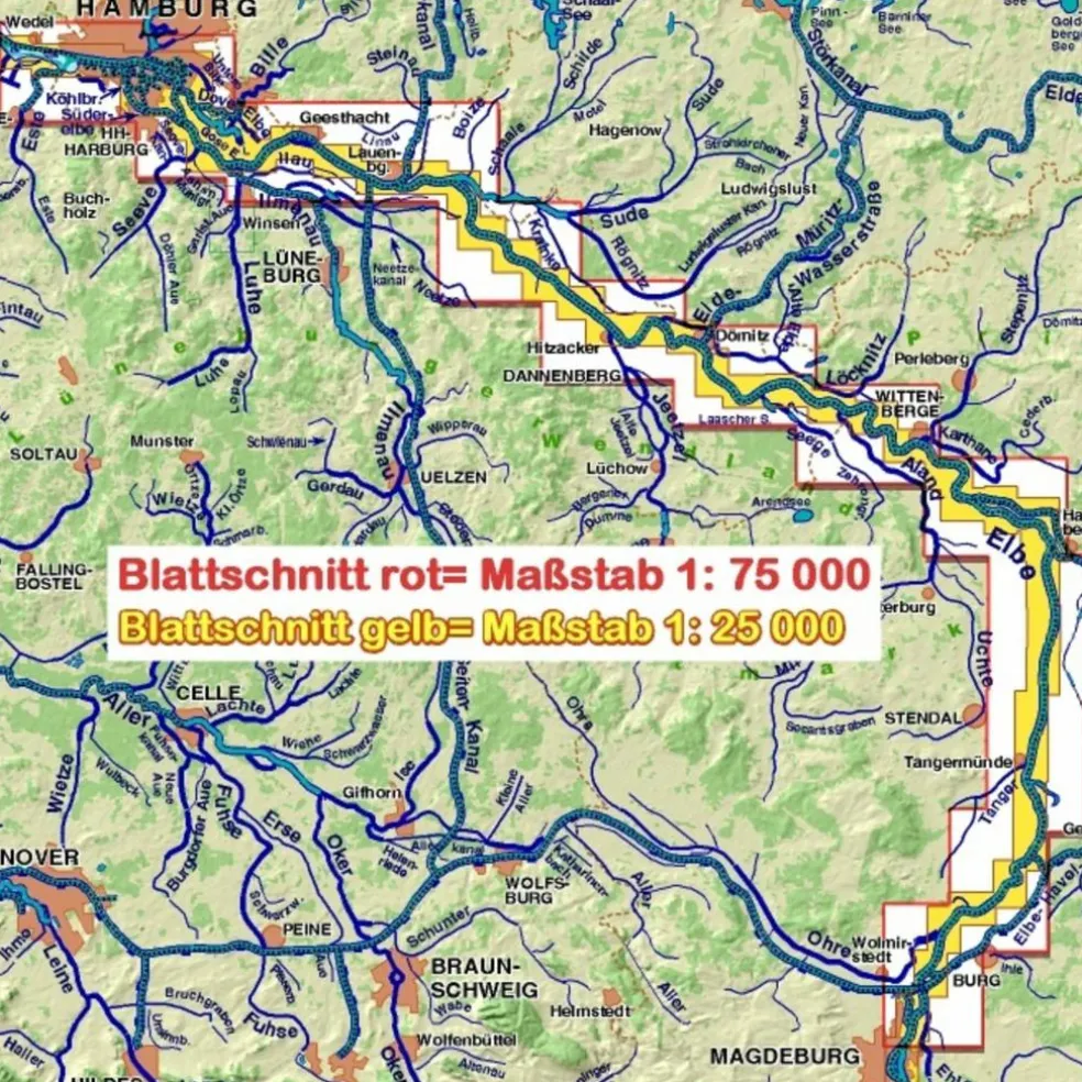 Durch die Kombination von Wasser- und Radwandern bieten sich zusätzlich sowohl preisgünstige Quartiere für Radler bei Wassersportvereinen, als auch trockene Unterkünfte in gewässernahen Pensionen für Wassersportler. Die Strecke wird komplett in zwei Maßstäben abgebildet: 1: 75.000 für Orientierung über längere Distanzen und 1: 25.000 z.B. zur Feinorientierung in den Städten.