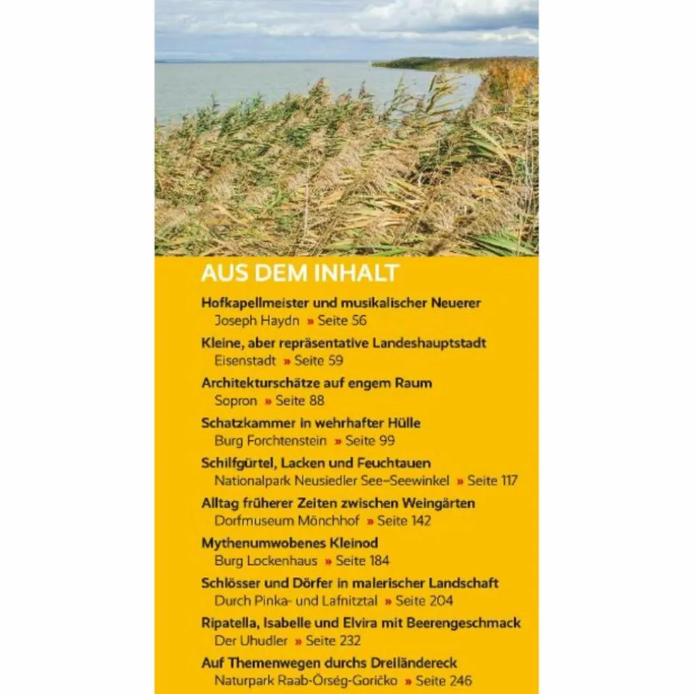Das Burgenland, das östlichste Bundesland Österreichs, vereint auf kleinem Raum eine große Anzahl an Baudenkmälern und Naturschönheiten. Im Norden, zur slowakischen und ungarischen Grenze hin, dominiert rings um den Neusiedler See die Pannonische Tiefebene, die zu großen Teilen unter Naturschutz steht. Nach Süden wird das Land hügeliger, und hier trifft man auch auf einige historisch und architektonisch bedeutende Burgen. Weiterhin locken unzählige gut ausgeschilderte Wanderwege, ein Radwegenetz von mehreren tausend Kilometern, zahlreiche Thermen sowie pittoreske Dörfer und Kleinstädte.