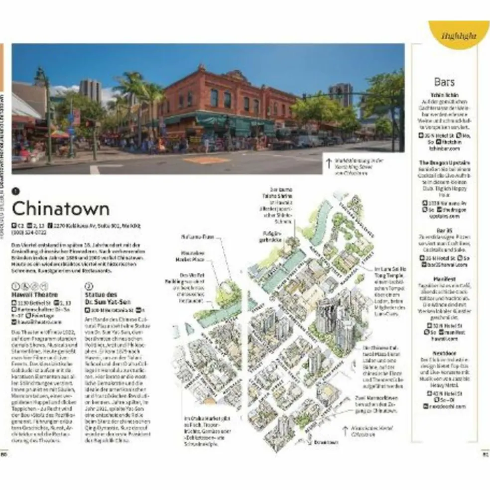 Handgezeichnete 3-D-Aufrisszeichnungen: Sensationelle Zeichnungen aus der Vogelperspektive bieten ganz neue und einmalige Einblicke in Hawaiis Sehenswürdigkeiten – zum Beispiel ins Chinatown in Honolulu oder in den Pu’uhonua o Honaunau National Historical Park auf Hawai’i Island. . Ausgewählte Top-Themen: Auf den bildgewaltigen Themenseiten des Hawaii-Reiseführers stehen charakteristische Besonderheiten im Fokus. Erfahren Sie Wissenswertes über die Geschichte von Hawaii, über Kultur, Surf-Legenden und die einheimische Küche oder die schönsten Fotomotive.