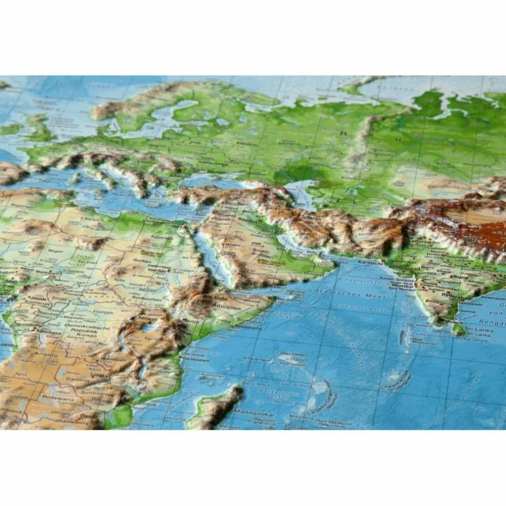 Die Georelief Weltkarte möchte dem Betrachter unseren Blauen Planeten vor Augen führen, so wie er noch nie wahrgenommen wurde.