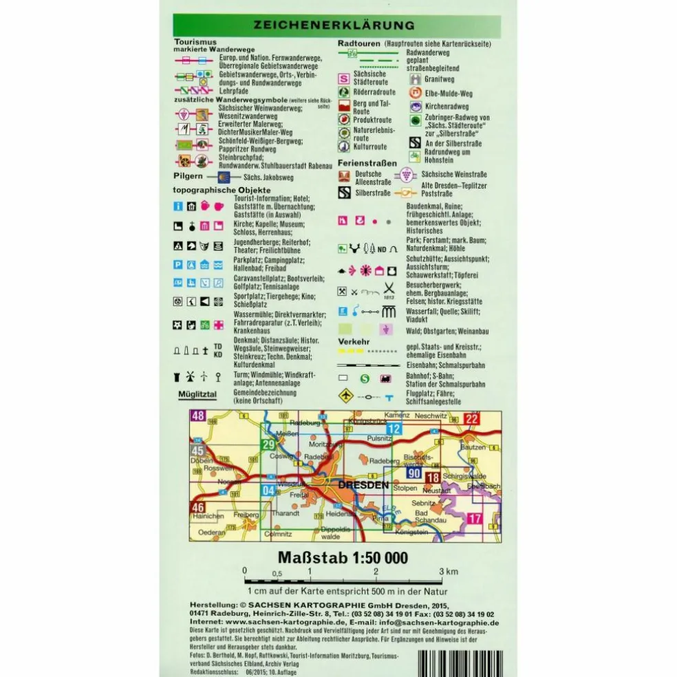 Umfasst das Ausflugsgebiet rund um Dresden – Moritzburg, Dresdner Heide, Schönfelder Hochland, Radeberg, Pirna, Stadt Wehlen, Tharandter Wald, Rabenauer Grund, Triebischtal, Meißen, Diesbar-Seußlitz sowie Radebeul.Die Karte beinhaltet alle markierten Wanderwege, Pilgerwege als auch Radwege mit deren Kennzeichnung.Durch die Darstellung der u.a. naturkundlichen, geologischen und historischen Informationen wird der Kartennutzer auf die großen und kleinen Sehenswürdigkeiten rechts und links des Weges aufmerksam gemacht.Auf der Kartenrückseite finden sich Text und Bild zu dem dargestellten Gebiet sowie Wander und Radroutenvorschläge.