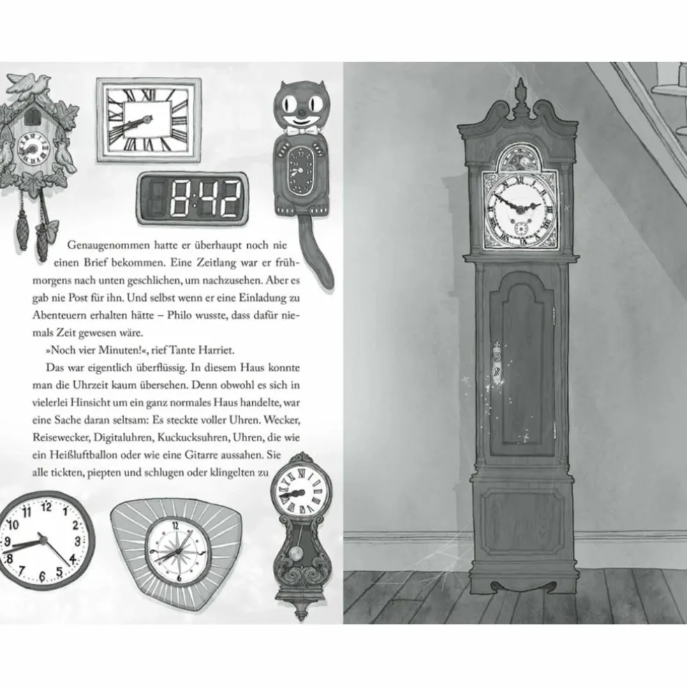 Philos Onkel und seine Tante haben eine stattliche Uhrensammlung. Alle Uhren ticken auf die Sekunde gleich. Einzig die große Pendeluhr tanzt aus der Reihe und schlägt ab und an auch mal 13.