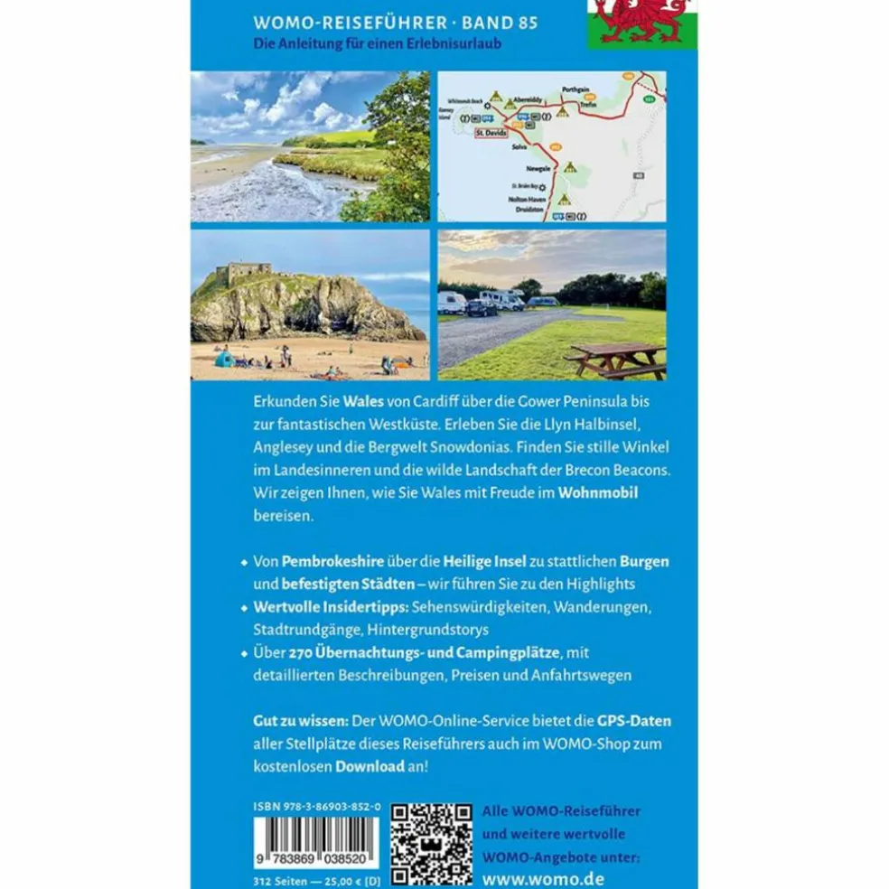 Sie starten im Südteil von Wales zwischen der Hauptstadt Cardiff und Swansea, erkunden die Gower Peninsula und die fantastische Westküste. Dann nehmen wir Sie mit zu den Stränden der Llyn Halbinsel, auf Anglesey und in die Bergwelt Snowdonias. Stille Winkel im Landesinneren und die wild geschwungene Landschaft der Brecon Beacons machen Ihrer Reise abwechslungsreich, wild und voller Geschichte. Wir zeigen Ihnen, wie Sie Wales mit Freude im Wohnmobil bereisen Entlang der Küste von Pembrokeshire, über die Heilige Insel im Norden und zu stattlichen Burgen und befestigten Städten wir führen Sie zu den Highlights Wertvolle Insidertipps: Sehenswürdigkeiten, Wanderungen, Stadtrundgänge, Hintergrundstorys Über 270 Übernachtungs- und Campingplätze, mit detaillierten Beschreibungen, Preisen und Anfahrtswegen