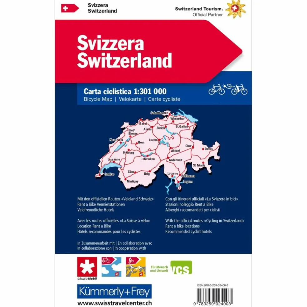 Veloland Schweiz Die beliebten VCS-Velokarten von Kümmerly+Frey vermitteln alle wichtigen Informationen, die sich Radfahrerinnen und Radfahrer vor und während der Fahrt wünschen: Steigungen, Höhendifferenzen, Strassenbeläge, Verkehrsaufkommen… Kantonale und nationale Velowege (Veloland Schweiz) und Mountainbike-Strecken sind speziell gekennzeichnet. Sie erleichtern das sichere Vorwärtskommen mit dem Velo. Index. Massstab: 1:301 000. Wasser- und reissfest.Laufzeit bis 2023