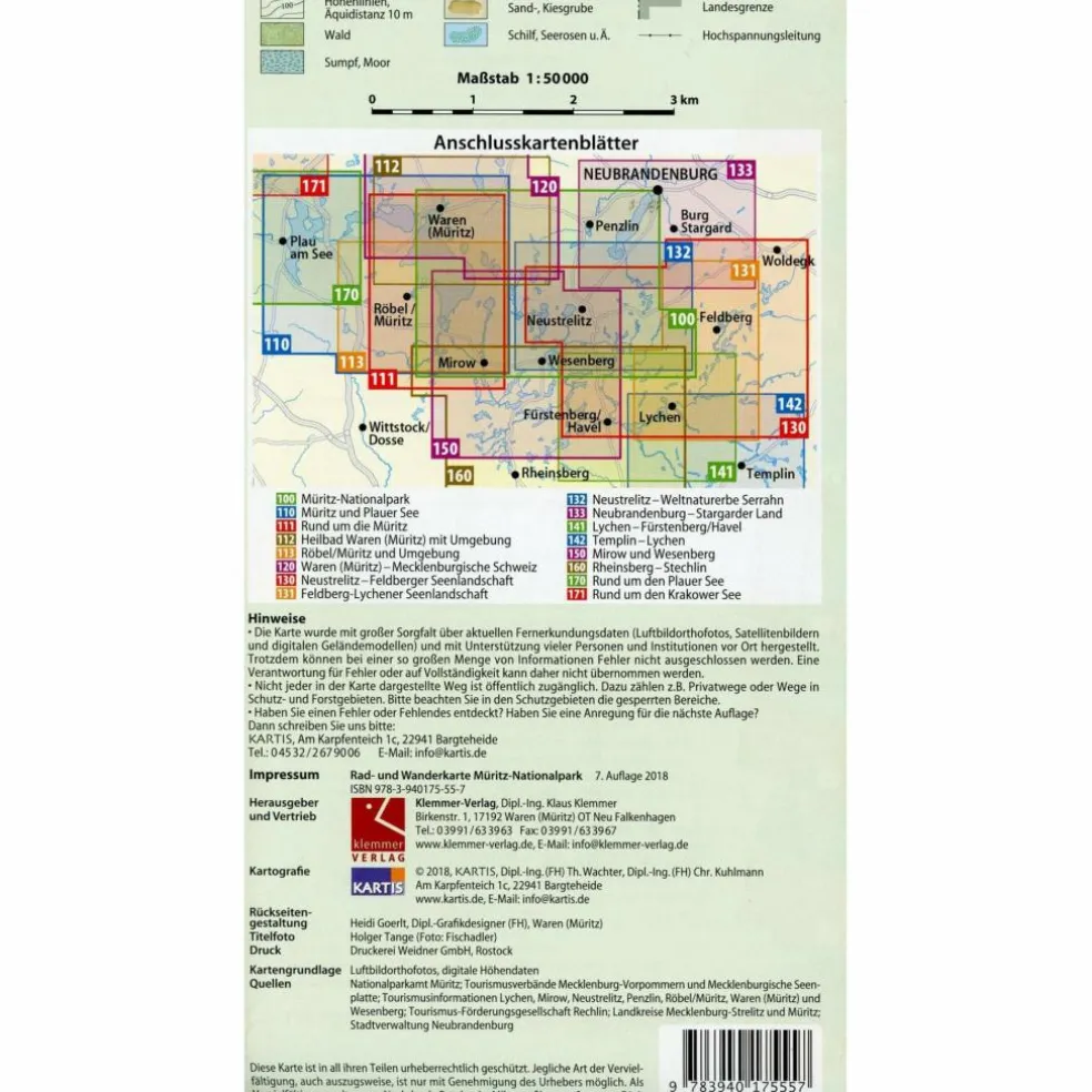 Die Karte ist eine der präzisesten für das Gebiet. Ihr Ausschnitt deckt den gesamten Nationalpark ab, also sowohl den Müritz-Teil mit Waren (Müritz) im Norden, einem großen Teil der Müritz, als auch den gesamten Serrahn-Teil mit dem UNESCO Weltnaturerbe im Süd-Osten im Landkreis Mecklenburgische Seenplatte. Deutlich zu erkennen ist der Seen- und Waldreichtum des Gebietes. Alle Wanderwege sind mit Entfernungsangaben dargestellt. Die Rückseite enthält Erlebnisstipps. Die Karte ist GPS-geeignet.