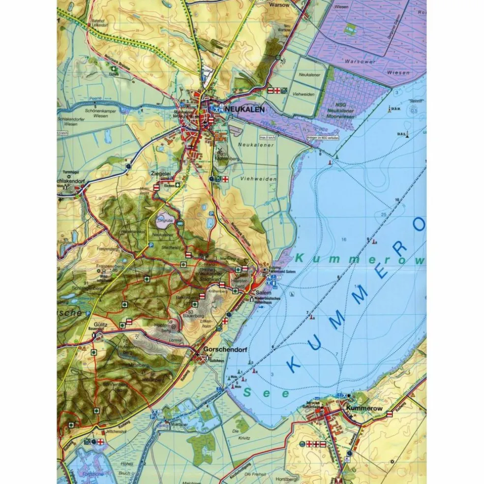 Der in der wasser- und reißfesten Karte zentral gelegene Kummerower See in der Mecklenburgischen Schweiz bildet den Schwerpunkt dieser speziellen Rad-, Wander- und Gewässerkarte (M 1:35.000).