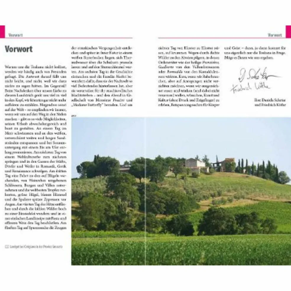 Übersichtsseiten mit Beschreibungen aller Regionen: Florenz, Chianti, Val die Pesa, Arezzo, Lucca, Pisa, Livorno, Siena, Grosseto, Montepulciano – Eine Jahresübersicht zu Festen und Veranstaltungen – Routenvorschläge und Inspiration für einzigartige Reiseerlebnisse durch persönliche Top-Tipps des Autorenpaars – Informationen zu allen Sehenswürdigkeiten – Reisewissen von A-Z – Zauberhafte Orte entdecken – den Kreuzgang von Torri, die Schlucht quer durch Loro Ciuffenna, die Gräber von Chiusi, das Vespa-Museum in Pontedera
