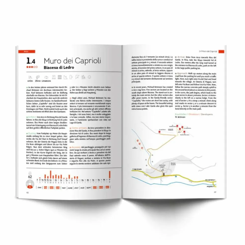 Massone, Nago, Padaro oder Terra Promessa haben in der Klettercommunity Weltruhm erlangt. In Arco und Umgebung gibt es unzählige Spots von einmaliger historischer Bedeutung, sie gelten als Geburtsstätten des Sportkletterns. Aber es werden auch ständig neue Klettergärten und Routen erschlossen. Der Kletterführer von September 2024 enthält 164 Gebiete, von denen 32 erstmals veröffentlicht werden. Entdecke im neuen Führer alle Routen auf Farbfoto-Topos, GPS Koordinaten und detaillierte Beschreibungen deiner Lieblingsgebiete in Arco und Umgebung!