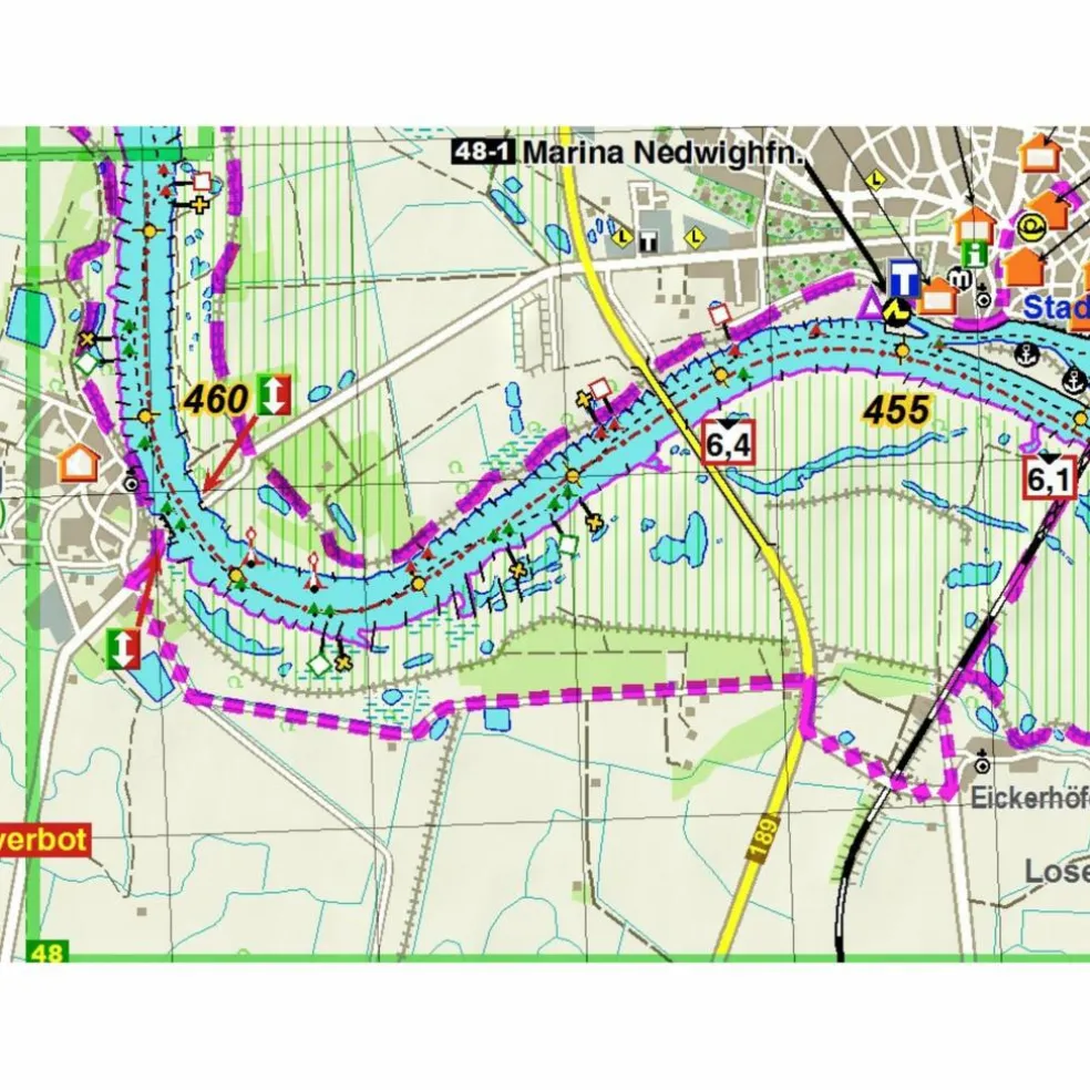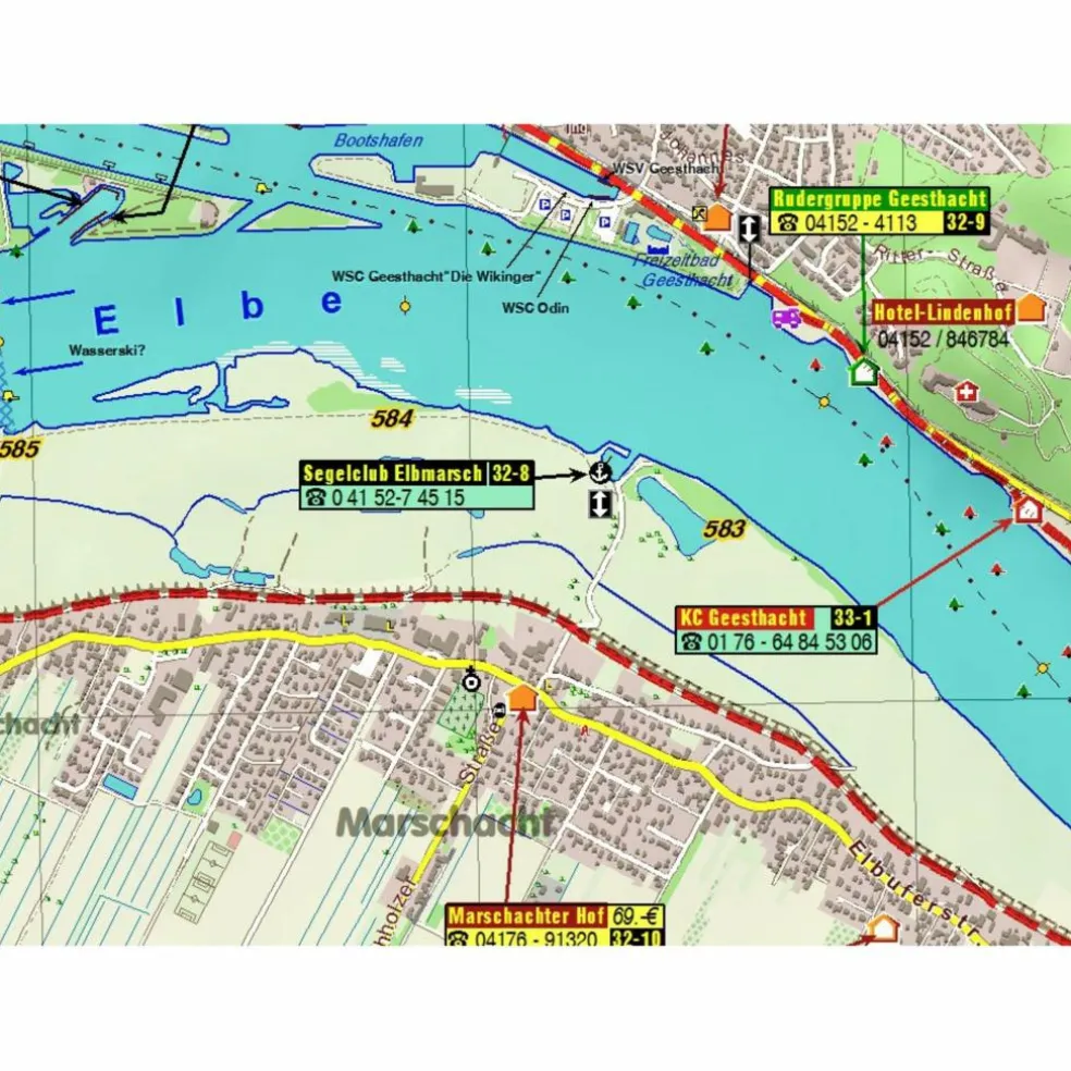Dieser Atlas bieten alle Informationen, die sowohl Wasserwanderer als auch Radfahrer unterwegs benötigen: Gewässer-km, Anlande- u. Befahrungsverbote, Rast- und Biwakplätze, Liegeplätze, Slip-, Ein- und Ausstiegsmöglichkeiten, Betonnung, Brückenhöhen, Anschriften- und Ausstattungsliste der Vereine und Campingplätze, und eine Kartendarstellung, die nicht hinter’m Deich aufhört, also auch für Landausflüge bestens geeignet. Für Radler ist selbstverständlich der offizielle Radweg dabei, aber auch Alternativrouten, schlechte Wegstecken, Steigungen, Quartiere, Bäcker, Lebensmittelgeschäfte, Restaurants, Sehenswürdigkeiten.