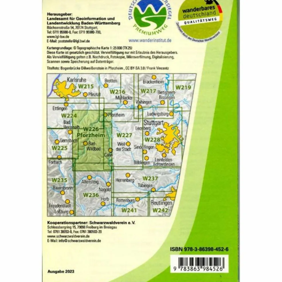 Inhalt:Im idealen Maßstab von 1:25 000 enthält die Wanderkarte alle in diesem Bereich vorkommenden Wanderwege des Schwarzwaldvereins wie den West-, Mittel- Ost- und Schwarzwald-Nordrandweg, des Schwäbischen Albvereins mit den Hauptwanderwegen HW5, HW8 und HW10 und des Odenwaldklubs. Außerdem sonstige Wanderwege wie den Hügelland-Wanderweg und den Hugenotten- und Waldenserpfad. Zahlreiche Erlebniswege ergänzen den Karteninhalt. Als Qualitätswanderwege „Wanderbares Deutschland“ bzw. als Premiumwege zertifizierte Wege wurden entsprechend gekennzeichnet.